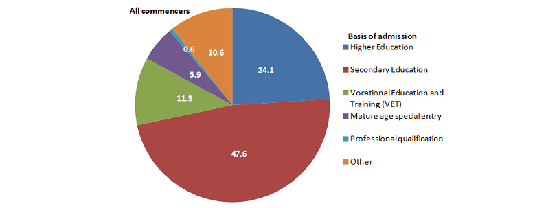 Among Australian students commencing university in 2011, almost half (47.6 per cent) were selected on the basis of outcomes in the final year of secondary school, a further 24 per cent gained entry on the basis of a prior higher education studies and 11 per cent were admitted based on prior vocational education and training (VET) studies. A further 11 per cent were selected by ‘other’ means, such as an interview, aptitude test or folio, while six per cent gained entry based on specific measures for mature-aged candidates.